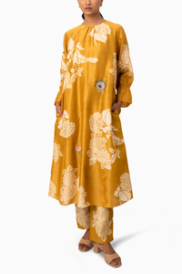 Featuring a stunning ochre floral printed tunic and pant set crafted from luxurious chanderi fabric. This elegant ensemble features a tunic with convenient pockets and exquisite gather detailing on the neckline, exuding timeless sophistication and effortless style.
