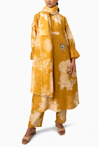 Introducing a stunning ochre floral printed tunic and pant set crafted from luxurious chanderi fabric. This elegant ensemble features convenient pockets in the tunic, exquisite gather detailing on the neckline, and comes complete with a matching dupatta for a touch of sophistication.