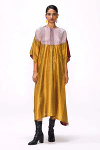 Handwoven silk striped kaftan with our signature shibori neckline, dyed in shades of magenta and ochre. A freesize garment, this kaftan can be worn front & back, offering two distinctly different looks.