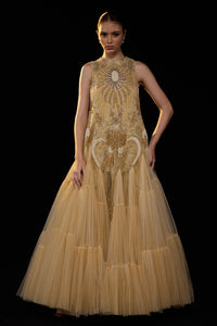 This ethereal golden gown features a sleeveless bodice adorned with intricate floral and sunburst embroidery.