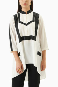 Graceful and modern, this top comes from the latest collection by Shivya K. Diagonal lines at the neck in white and hem lend a directional edge to the flowing silhouette. Crafted in twill georgette makes this tunic particularly comfortable to wear. Mirror the label's styling by layering it over slim-fitting pants.