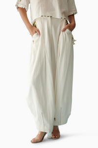 Featuring the Off-White Banana Tree Applique Baggy Pants by Nikasha. Embrace relaxed style with off-white baggy pants adorned with a playful banana tree applique and charming handmade flower tassels detailing, all crafted from 100% cotton. Elevate your comfort with a touch of unique flair.