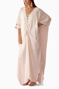 Featuring the Off-White Banana Tree Applique Kaftan by Nikasha. Experience elegance in this kaftan adorned with banana tree applique and handmade flower tassels detailing, all in luxurious 100% cotton.