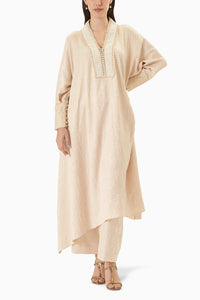 Timeless elegance meets comfort with Ritika Arya Jain's Off-White Crushed Satin Kaftan Kurta Set. Crafted from luxurious crushed satin, this two-piece set offers a true-to-size fit in a sophisticated off-white hue, perfect for both casual and formal occasions.