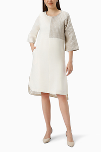 Wander through the serene woods on fine linen, gleaming in gold with abstract brush strokes, textures, and patterns that come to life through meticulous hand screen printing and foiling- elevating your style quotient to a new high this season. A round-neck, asymmetrical dress, with 1/8th detailing.