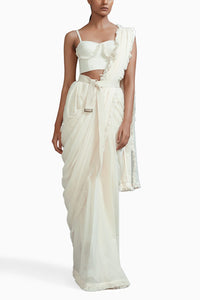 Featuring a modern mul saree with fringe-detailing on the borders.