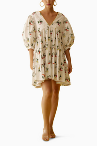 Off-White Hand Painted Chilli Print Bubble Sleeve Tier Dress