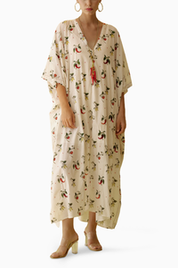 Featuring the Off-White Hand-Painted Chilli Print Midi Dress by Nikasha. Embrace artistic allure with an off-white midi dress showcasing hand-painted chilli print and thread fringe detailing on the neckline, crafted from 100% cotton. Elevate your style with this unique and elegant ensemble.