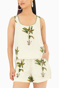 Featuring Off-White Hand Painted Co-ord Set by Nikasha from Under The Banyan Tree Collection. Crafted from 100% crepe, this ensemble showcases charming blanket stitch details on the neckline and pockets, blending artistic flair with relaxed sophistication.