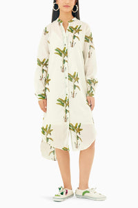 Featuring Off-White Hand Painted Shirt Dress by Nikasha from Under The Banyan Tree Collection. Made from 100% cotton, this dress showcases exquisite hand-stitch details on the cuffs and collar, combining a charming print with artisanal craftsmanship for a refined, sophisticated look.