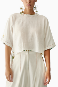 Featuring the Off-White Hi-Low Crop Top by Nikasha. Elevate your wardrobe with an off-white crop top showcasing a hi-low silhouette, adorned with a charming banana tree applique and meticulous hand-stitched details, all crafted from 100% cotton. Embrace a blend of style and comfort.