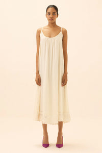 A single-step white dress with a graceful round-neckline, flowing effortlessly for an airy, gorgeous silhouette.
