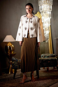Featuring the Off-White Julia Jacket by ANAHE, this elegant jacket is adorned with intricate embroidery, adding a touch of sophistication and style. Its refined design and timeless color make it the perfect versatile piece for both casual and formal occasions.