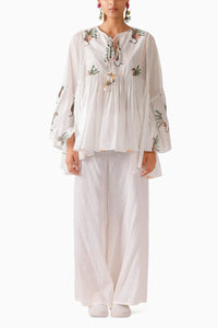 Featuring the Off-White Leopard Embroidered Top by Nikasha from its Cheetah Collection. This ivory cotton top showcases intricate hand embroidery in a bold leopard print, accented with a front tie-up and handmade tassel detailing—blending fierce style with handcrafted elegance.