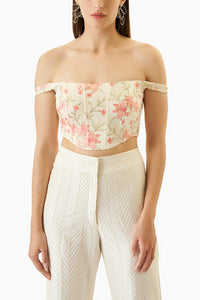 A floral embroidered corset is made from cotton fabric features an off shoulder sleeves. Gold metal zip at the back define the structured fit.