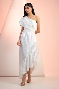 Featuring Off White Love Dress by Mandira Wirk's Love Note Collection. This elegant solid dress showcases a one-shoulder satin silhouette with a graceful high-low hem, perfect for making a refined and romantic style statement.
