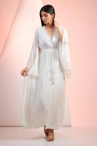 Featuring Off White Love Long Flow Dress by Mandira Wirk's Love Note Collection. This solid long, flowy dress features a flattering V-neckline and delicate tassel detailing at the waist, creating an elegant and effortlessly chic silhouette.