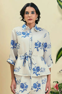 Chic and versatile,this shirt showcases all-over embroidery with a waist drawstring that creates a subtle peplum effect. It includes a separate inner slip for added comfort and ease. Finished with contrast stitch detailing along the edges and seams for a sharp, modern look.