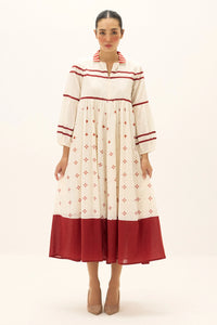 An airy, voluminous dress in handwoven cotton mul, featuring embroidered geometric motifs and contrast panel detailing in deep red. The gathered waist, striped collar, and full sleeves lend it a relaxed yet refined silhouette that moves with graceful ease.