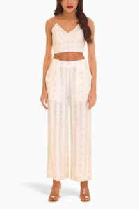 A fusion of allure and elegance that captures the essence of romance. Crafted from premium fabric in a soft off-white hue, this bustier exudes sophistication with its delicate embroidery and figure-enhancing silhouette. Paired with palazzo pants, crafted from premium fabric in a soft off-white hue, these pants feature delicate embroidery that adds a charm.