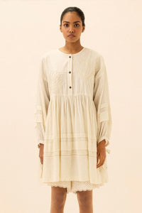 A classic white dress with full sleeves and a simple round neckline, offering timeless ease and beauty.