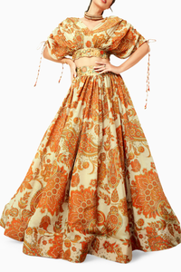 The Off White Printed Tissue Organza Waist Embellished Lehenga is a stunning ensemble that captures the essence of traditional elegance with a contemporary twist. The lehenga features intricate prints on lightweight tissue fabric, creating a graceful drape and adding a subtle sheen to the garment. Adorned with delicate embellishments at the waist, it accentuates the silhouette beautifully, blending sophistication with modern design elements. Complementing the lehenga is a seamlessly crafted blouse and bustier combination, ensuring a seamless fit and enhancing comfort.