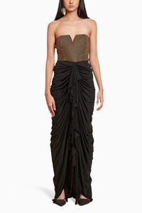 Featuring OG Super Glam Grecian Opera Gown by Siddartha Tytler from Checkmate Collection. The black grecia draped spandex gown adorns a sleek, draped silhouette with an olive crystal mesh bust. Combining luxurious spandex with shimmering crystal details, this gown offers a sophisticated, modern look with a touch of glamour.