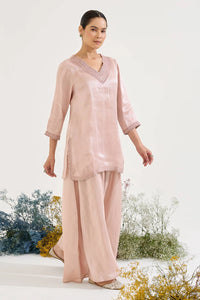 Old Pink Charm Tissue Kurta with Sharara set is a refined yet striking ensemble that combines timeless elegance with modern detailing. Whether you're attending a wedding, festival, or an evening celebration, this set is sure to make you the center of attention.