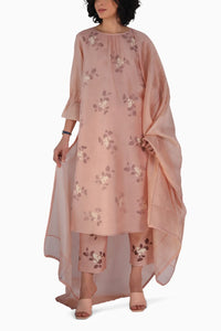 The Old Rose Tunic presents a timeless charm with its delicate Lavender Sakura print. Crafted with meticulous detail, this tunic boasts a double-layered design, combining the sheer elegance of organza with the luxurious texture of silk chanderi. Completing the look is a dupatta, adding a final flourish of elegance.