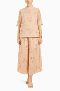 This stylish ensemble features an old rose printed top, offering a soft, feminine touch with its elegant floral design. Paired with comfortable culottes in linen, the outfit combines casual ease with a chic, modern aesthetic. The breathable linen fabric ensures all-day comfort, making it perfect for a relaxed yet fashionable look.
