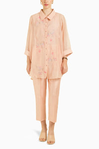 This ensemble features a beautifully crafted old rose shirt in Mul Chanderi, adorned with intricate embroidery for a touch of elegance. Paired with straight pants in Silk Chanderi, this combination offers a perfect balance of sophistication and comfort, ideal for both casual and semi-formal occasions. The luxurious fabric and fine detailing make it a timeless addition to any wardrobe.