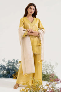 Fabric- Kurta and Pants- Tissue, Dupatta- Kota Tissue Color- Kurta and Pants- Mustard, Dupatta- Gold Embroidery- Kurta and Pants- Aari Embroidery , Dupatta- Machine Embroidery Fit- Relaxed Fit Size Worn by Model- S Model Height- 5'5 Components- 3 Product Code- SVENEROSTKS26&STD26