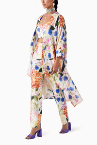Step into the spotlight with Oleana Green Multicolored cape and bustier set, paired elegantly with pants. Crafted from Chanderi fabric, this 3-piece ensemble radiates charm and captures attention with its vibrant colors.
