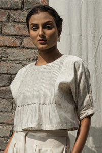 This charming top features a pin-tucked front yoke adorned with delicate French knots, blending sensuality with sophistication. The sheer chanderi fabric, paired with floral-printed cotton lining, creates an enchanting, dreamy effect. With a keyhole opening at the back, dolman sleeves, and MOP buttons, this piece effortlessly combines elegance and allure.