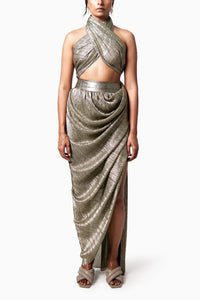 Composition- Pleated Metallic Colour- Olive Fit-This sari fits true to size, takes the shape of your body as it is a drape. The sari is high waisted, get it according to your high waist size. Customization - There will be an additional 10% charge Size Guide- Measurements in the size guide are ready garment measurements Components- Product code - SVE43182211602