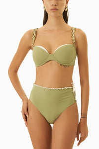 Olive Calico push-up classic Bikini Set multi-coloured straps on shoulder with white accent details. Comes with Modest Coverage and High-waist Medium Cut Bottoms.