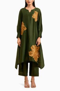 Presenting a long kurta with a unique dipped hemline and a chic keyhole neckline, creating an elegant and modern silhouette. The full sleeves are detailed with pinched cuffs and delicate floral appliqué embroidery, adding a refined touch of sophistication. Paired with ankle-length, straight-fit pants, this ensemble seamlessly combines comfort with contemporary style, making it ideal for both casual and formal occasions.