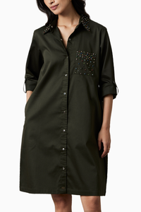 Olive Collar Pocket Swarovski Stud Shirt Dress