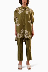 Elevate your wardrobe with this sophisticated ensemble featuring an Olive Discharge Print Oversized Shirt and Pant. Crafted from Cotton Chanderi for the top and Silk Chanderi for the pant, this ensemble offers a blend of comfort and style. Perfect for both casual outings and special occasions.