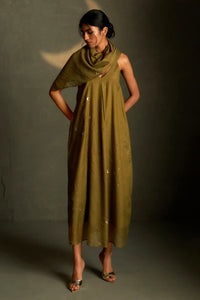 This ankle-length mul chanderi dress is a festive standout, adorned with subtle star motifs and a crescent moon in real glass, placed to evoke the beauty of distant galaxies. Designed with slender adjustable shoulder straps and a flattering V-neckline, it features deep pleats that add graceful volume and movement. Pair it with an embroidered square scarf draped around your neck for an ethnic touch, making it perfect for festive occasions where you want to stand out with effortless elegance.