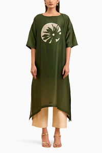 This Olive-colored long kurta with a dipped hemline and an elegant boat neck exudes effortless style and sophistication. Featuring a modern dropped shoulder design, 3/4th sleeves, and front panel applique, this piece adds a contemporary edge to classic elegance. Paired with ankle-length, straight-fit pants, the ensemble offers a perfect blend of comfort and refined style, making it ideal for any occasion.