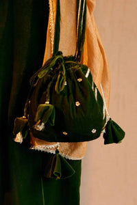 Featuring the Olive Embroidered Potli Bag, this velvet accessory adds an elegant touch to your festive outfits. Adorned with delicate floral embroidery and gota embellishments, it beautifully enhances your look. The lightweight handle, detailed with gota, adds sophistication, while velvet gota-embellished tassels bring extra charm.