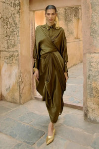 Featuring Olive Green Nyra Set by Ritika Arya Jain's RAYA collection, a two-piece ensemble crafted in rich, light-catching fabric. The sculpted drape at the waist adds depth and dimension, while the soft sheen enhances every elegant fold.