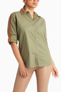 This olive green shirt features bold "Grateful" embroidered text on the back, paired with a vibrant tape detail along the sides. A perfect mix of gratitude-inspired design and modern, sporty accents.