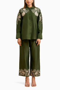 This Olive Green co-ord set features a chic shirt adorned with intricate appliqué work and embroidery on the front panels and sleeves, adding a touch of sophistication to the design. Paired with ankle-length pants, which are beautifully detailed with matching appliqué and embroidery at the bottom, this ensemble offers a perfect balance of elegance and comfort. Ideal for both casual and semi-formal occasions, this set brings together timeless style and modern flair.
