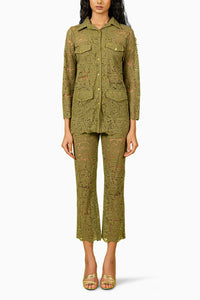 This olive guipure lace shirt and pants set, finished with elegant gold buttons, offers a chic blend of structure and femininity. Perfect for evening outings and get-togethers, style it with a sleek sling and statement jewellery to elevate its sophisticated charm.