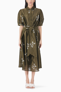 Introducing our elegant olive leaf print puff sleeve dress, crafted from luxurious silk chanderi for a sophisticated look and feel.