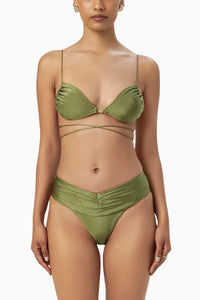 Barely there, impossibly bold. The Mistral bikini top is softly structured with adjustable ties for a graceful lift and personalised fit. Designed for the modern muse with an eye for subtle statement, this piece features sleek triangle cups and ruching details that flatters the form with elegant ease. A delicate gold-tone embellishment at the center adds a hint of glamour.