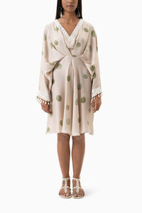Featuring olive polka dot printed dress having machine embroidery on the neckline & sleeves in white thread and mirror work alternating with silver coins