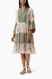Featuring peach and olive green polka dots with olive stripes tier dress